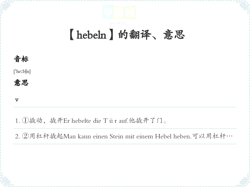 ①撬动,撬开Er hebelte die Tür auf.他撬开了门。