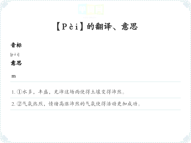 ①水多,丰盛,充沛这场雨使得土壤变得沛然。