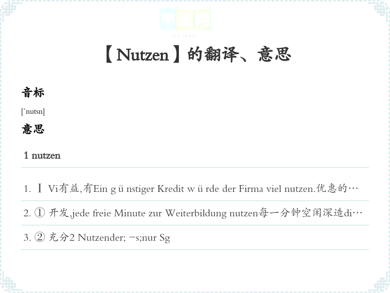 ① 开发,jede freie Minute zur Weiterbildung nutzen每一分钟空闲深造die Wasserkraft zur Erzeugung von Strom nutzen水力发电