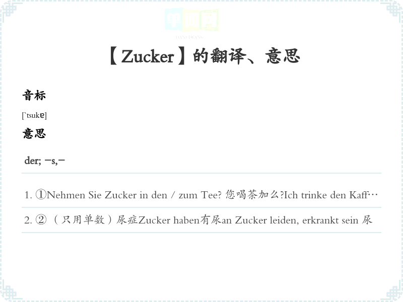 ①Nehmen Sie Zucker in den / zum Tee? 您喝茶加么?Ich trinke den Kaffee ohne Zucker.我喝咖啡不加。