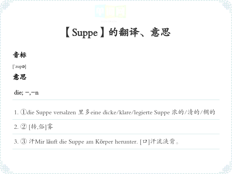 ①die Suppe versalzen 里多eine dicke/klare/legierte Suppe 浓的/清的/稠的