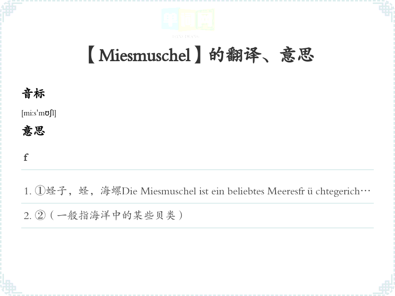 ①蛏子,蛏,海螺Die Miesmuschel ist ein beliebtes Meeresfrüchtegericht.蛏子是一种受欢迎的海鲜菜肴。