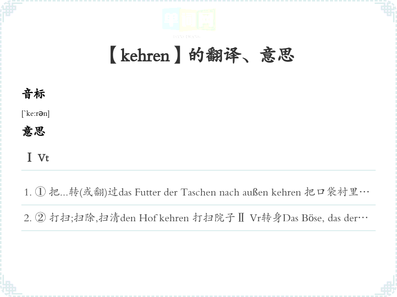 ② 打扫;扫除,扫清den Hof kehren 打扫院子Ⅱ Vr转身Das Böse, das der Mensch tut, kehrt sich meist gegen ihn selbst. 作恶者往往自食其果。Ⅲ Vi(h)<瑞>掉头 瑞>Der Zug fährt nur bis Frankfurt und kehrt dort. 那辆火车法兰克福并在哪儿掉头。Ⅳ Vi(s)[旧] 回,归nach Hause kehren 回家语法搭配sich+四格, +四格, gegen+四格