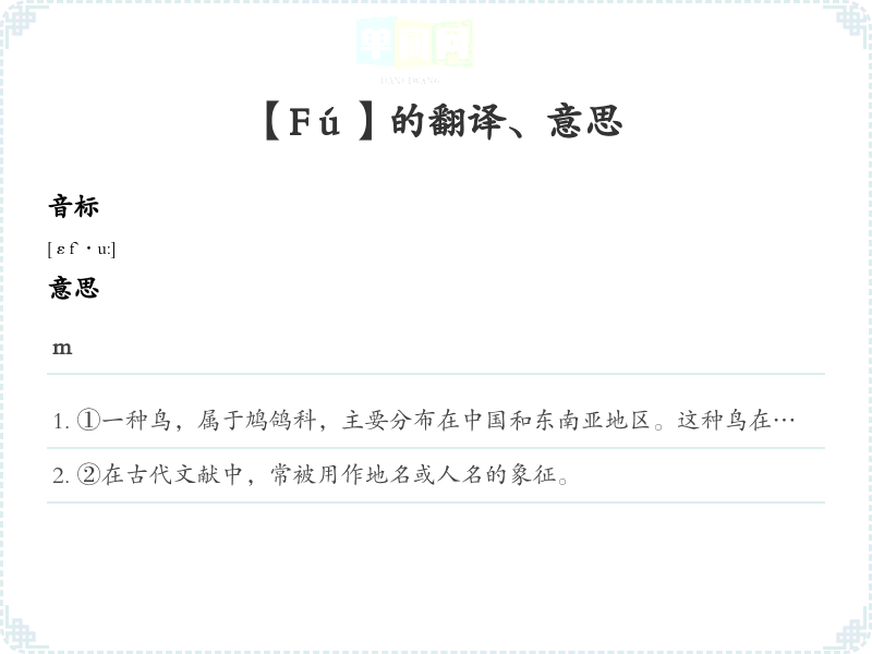 ①一种鸟,属于鸠鸽科,主要分布在中国和东南亚地区。这种鸟在古代常被用于象征和平和友谊。