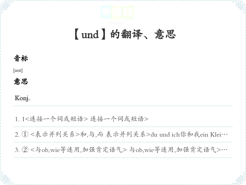 ① <表示并列关系>和,与,而 表示并列关系>du und ich你和我ein Kleid mit roten und schwarzen Streifen.带红色和黑色条纹的女服Ich habe Klavier gespielt, und er hat gelesen. 我弹了钢琴,而读了书。
