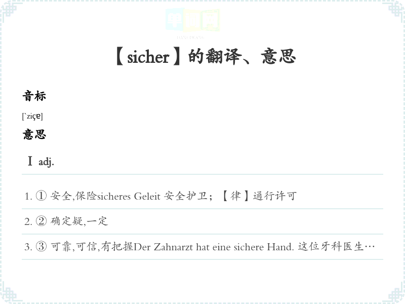 ③ 可靠,可信,有把握Der Zahnarzt hat eine sichere Hand. 这位牙科医生手艺好。