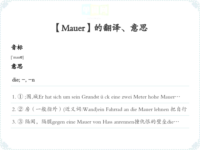 ② 房(一般指外)(近义词:Wand)ein Fahrrad an die Mauer lehnen 把自行