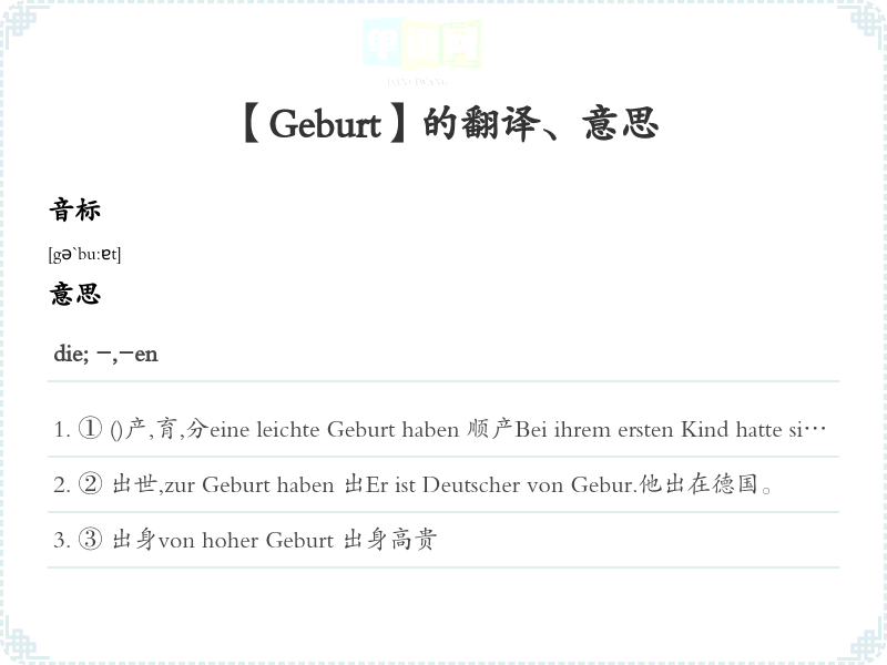 ① ()产,育,分eine leichte Geburt haben 顺产Bei ihrem ersten Kind hatte sie eine schwere Geburt.她头胎是难产。