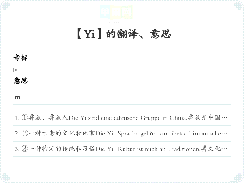 ③一种特定的传统和习俗Die Yi-Kultur ist reich an Traditionen.彝文化丰富多彩。