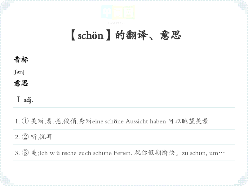 ③ 美;Ich wünsche euch schöne Ferien. 祝你假期愉快。zu schön, um wahr zu sein 令人不能相信