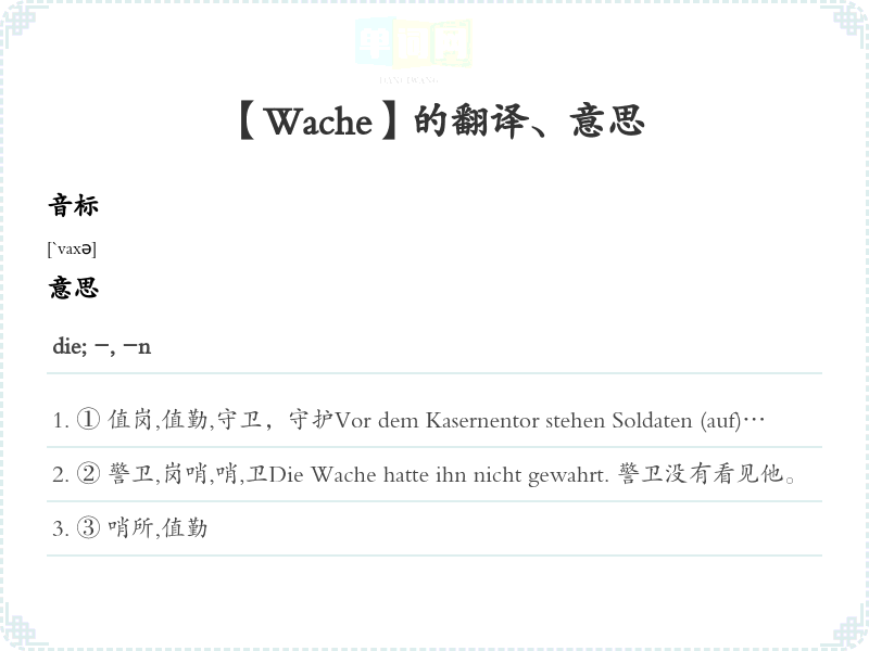 ② 警卫,岗哨,哨,卫Die Wache hatte ihn nicht gewahrt. 警卫没有看见他。