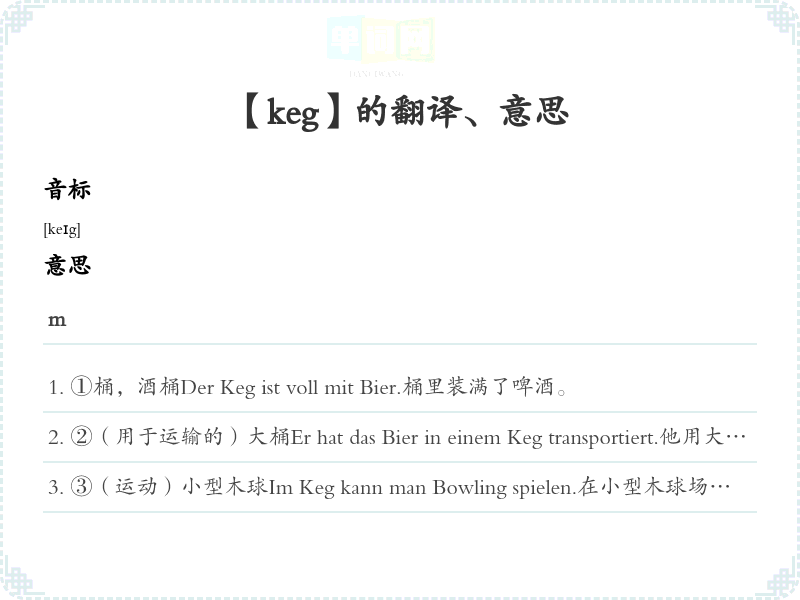 ①桶,酒桶Der Keg ist voll mit Bier.桶里装满了啤酒。