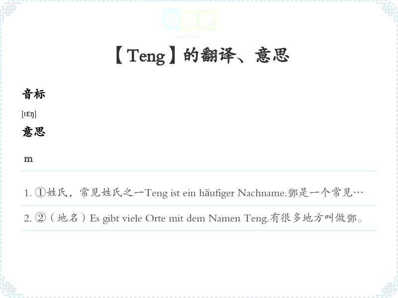 ①姓氏,常见姓氏之一Teng ist ein häufiger Nachname.鄧是一个常见的姓氏。