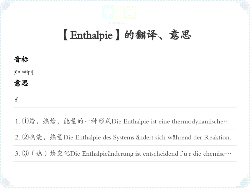 ①焓,热焓,能量的一种形式Die Enthalpie ist eine thermodynamische Funktion, die die Energie eines Systems beschreibt.