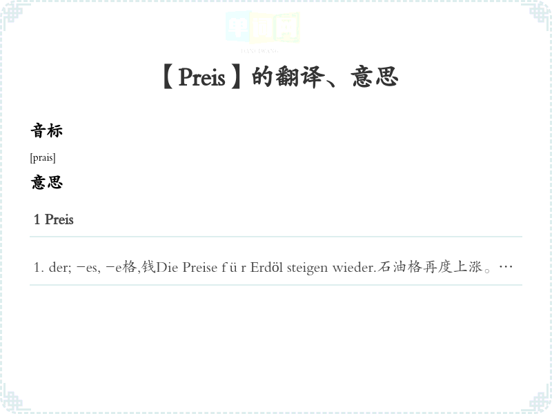 格,钱Die Preise für Erdöl steigen wieder.石油格再度上涨。2 Preisder; -es, -e奖赏,奖金3 Preisder; -es;nur Sg称赞,表扬,赞扬= Lob