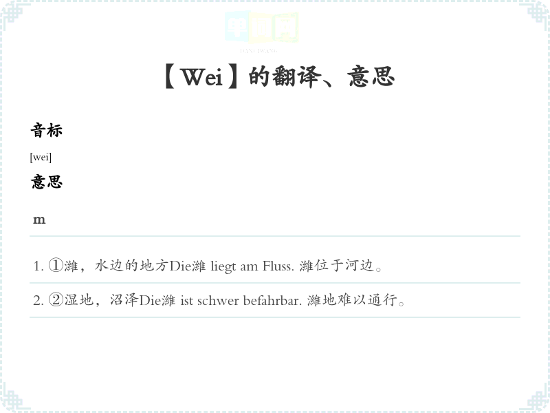 ①濰,水边的地方Die濰 liegt am Fluss. 濰位于河边。