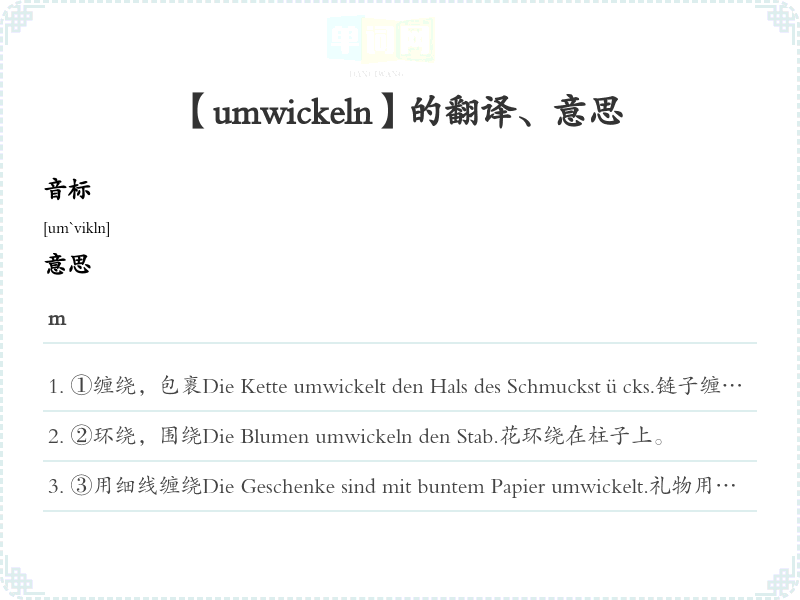 ①缠绕,包裹Die Kette umwickelt den Hals des Schmuckstücks.链子缠绕在首饰的脖子上。