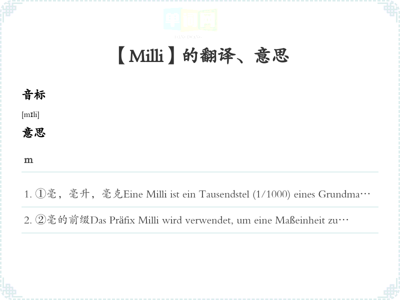 ②毫的前缀Das Präfix Milli wird verwendet, um eine Maßeinheit zu bezeichnen, die ein Tausendstel eines Grundwertes ist.毫作为前缀用于表示某一基本单位的千分之一。