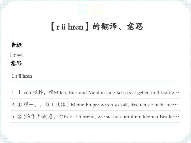 Ⅰ vt/i.搅拌,搅Milch, Eier und Mehl in eine Schüssel geben und kräftig rühren. 把牛奶,鸡蛋和面粉放入碗内并且用力搅拌。die Soße rühren, damit sie nicht anbrennt搅汤汁不让它糊Ⅱ vt.把...放入...搅拌Kakaopulver in eine Creme rühren 把可可粉放入奶油搅拌2 rührenⅠvt.