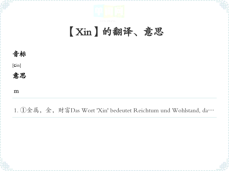 ①金属,金,财富Das Wort 'Xin' bedeutet Reichtum und Wohlstand, da es aus drei '金' besteht. 这个词'鑫'意味着财富和繁荣,因为它由三个'金'组成。