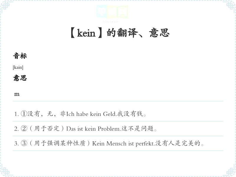 ①没有,无,非Ich habe kein Geld.我没有钱。