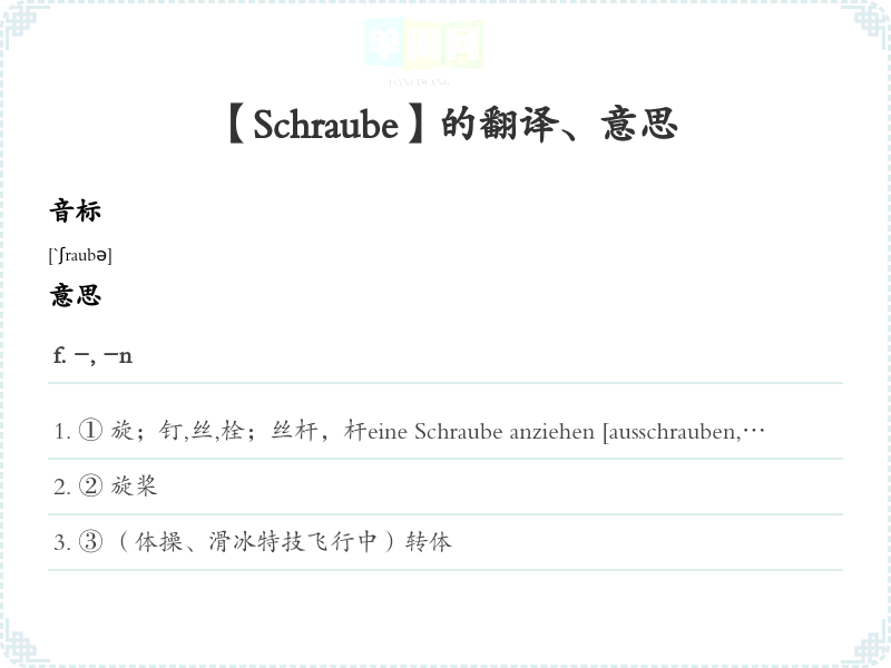 ① 旋;钉,丝,栓;丝杆,杆eine Schraube anziehen [ausschrauben, einschrauben, lockern]把丝拧紧(拧下来,拧上去,拧松)ein Regal mit Schrauben an der Wand befestigen 用丝把架固定到墙上