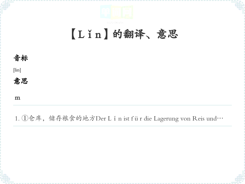 ①仓库,储存粮食的地方Der Lǐn ist für die Lagerung von Reis und anderen Lebensmitteln.仓库用于储存米和其他食品。