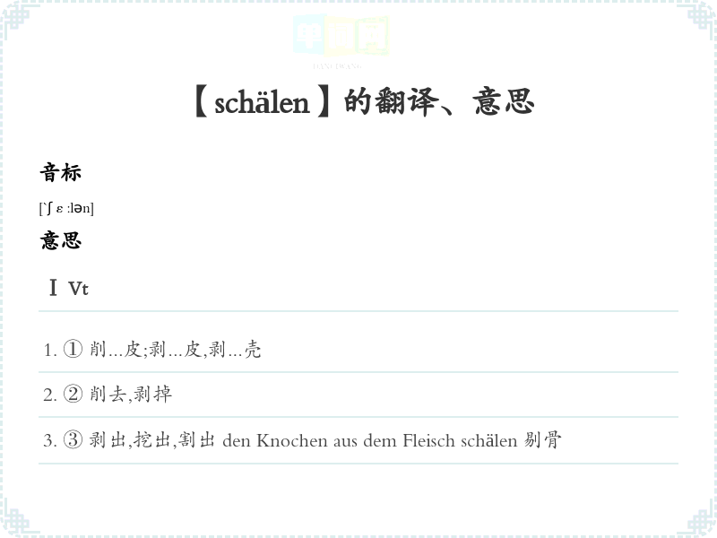 ③ 剥出,挖出,割出 den Knochen aus dem Fleisch schälen 剔骨