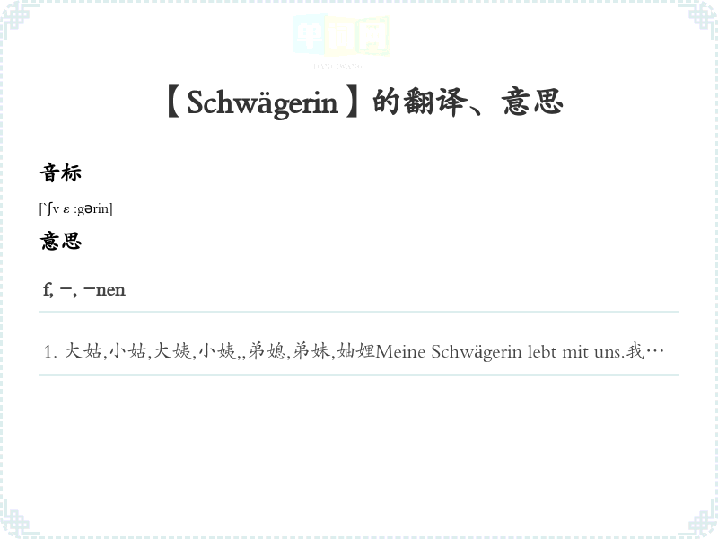 大姑,小姑,大姨,小姨,,弟媳,弟妹,妯娌Meine Schwägerin lebt mit uns.我的小姑我们一起生活。