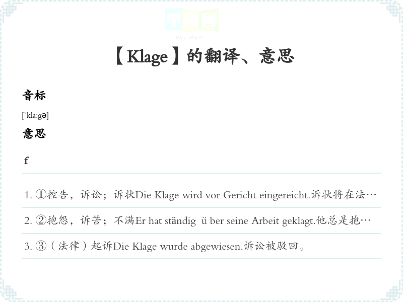 ②抱怨,诉苦;不满Er hat ständig über seine Arbeit geklagt.他总是抱怨自己的工作。
