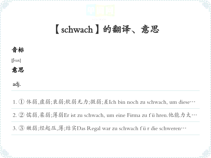 ⑤ 淡,薄,浓度低;弱Das ist ein schwacher Trost.这是一个淡淡安慰。