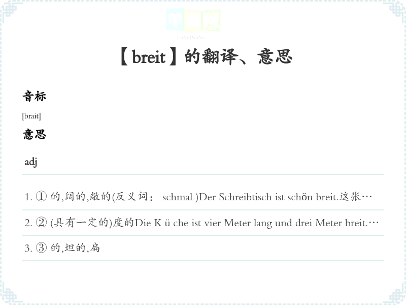① 的,阔的,敞的(反义词: schmal )Der Schreibtisch ist schön breit.这张写字。