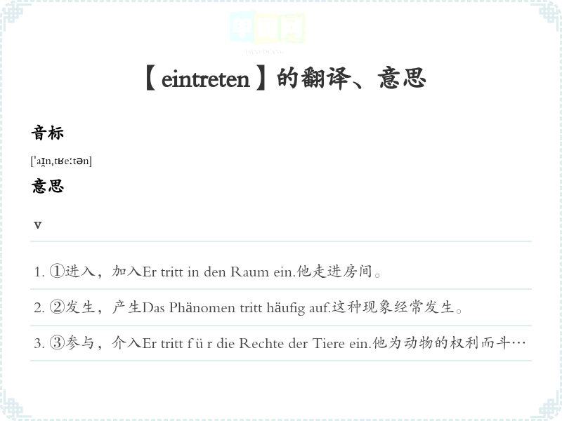 ①进入,加入Er tritt in den Raum ein.他走进房间。