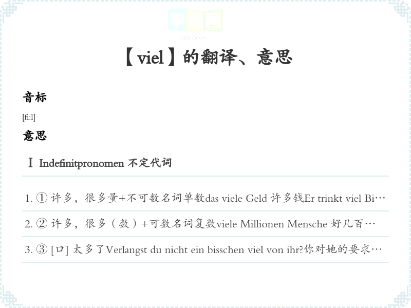 ④ 很大程度上,很Sie sorgt sich viel um ihre Zukunft.她很担心她的未来。Das ist bei uns nicht viel anders.这在我们那里也差不多(没什么两样)。Ⅲ Partikel(小品词)诘,示“没什么”Was soll ich noch viel erzählen, gleich wirst du es selbst erleben. 那我还有啥还说的(没什么要谈的),马上你就会亲身经历了。Was gibt es da noch viel zu fragen?Tu lieber, was ich sage! viel sagend viel versprechend.这还有啥(没什么)好问的呢?最好照我说的做吧。