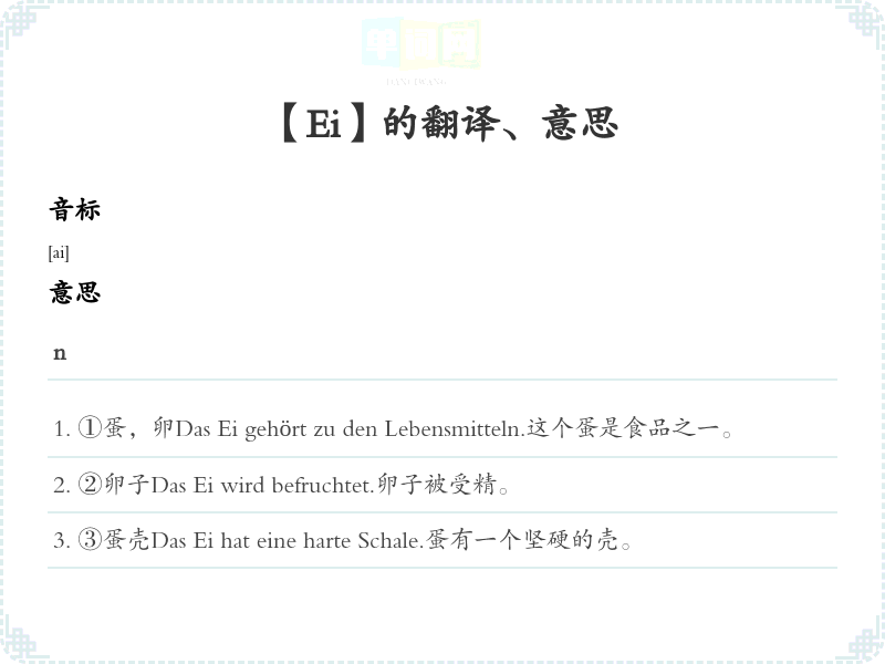 ①蛋,卵Das Ei gehört zu den Lebensmitteln.这个蛋是食品之一。