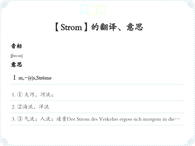 ③ 气流;人流;通量Der Strom des Verkehrs ergoss sich morgens in die Innenstadt.早晨汽车流入市区。mit dem Strom schwimmen随大流gegen/wider dem Strom schwimmen逆潮流,不随大流Ⅱ m,-(e)s, nur Sg流,den Strom einschalten, abschalten, ausschalten开通,切断,关闭流etw. steht unter Strom某物,某物有Als er den Fernseher reparierte, bekam er einen Schlag, weil die Rückwand unter Strom stand.他在修理视机的时候被了一下,因为后线路板。