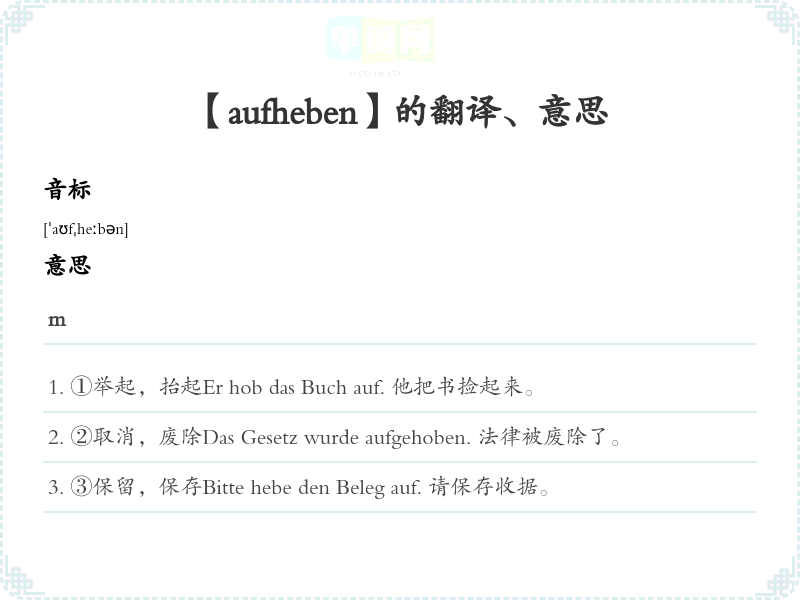 ①举起,抬起Er hob das Buch auf. 他把书捡起来。