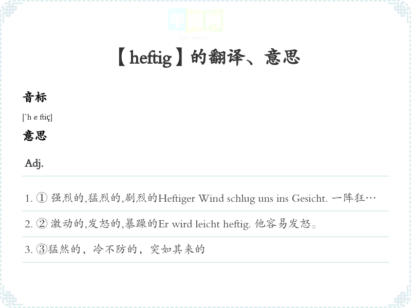 ① 强烈的,猛烈的,剧烈的Heftiger Wind schlug uns ins Gesicht. 一阵狂风们脸上。