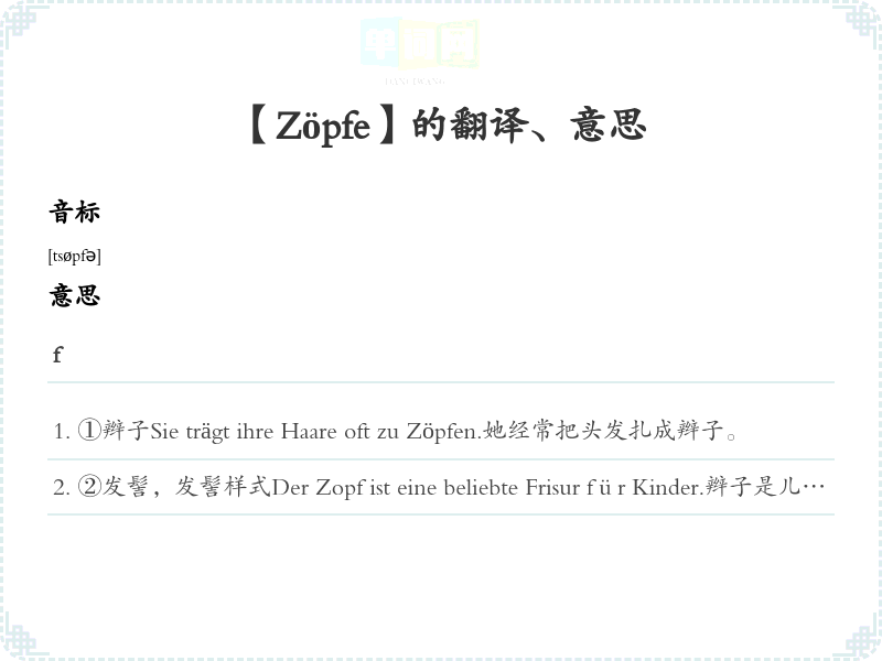 ②发髻,发髻样式Der Zopf ist eine beliebte Frisur für Kinder.辫子是儿童常见的发型。