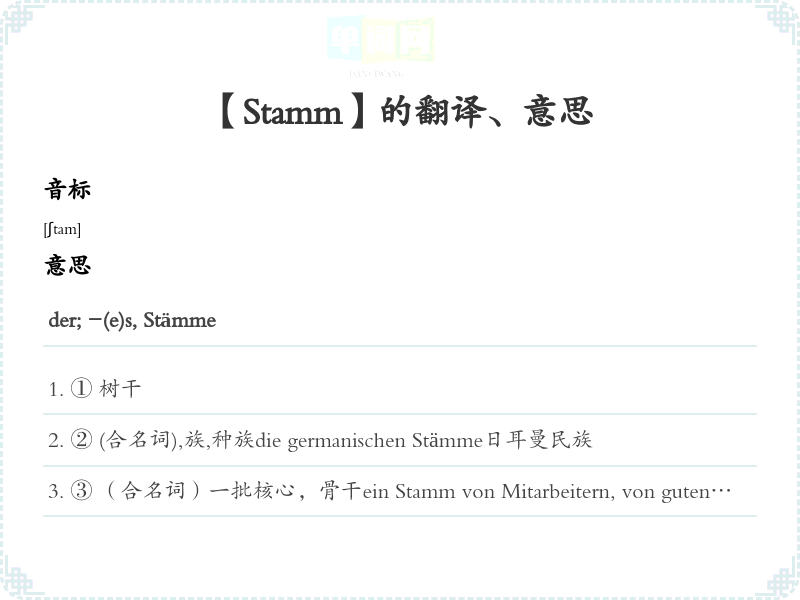 ② (合名词),族,种族die germanischen Stämme日耳曼民族