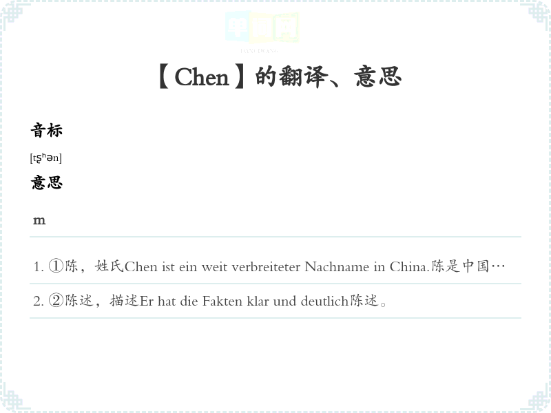 ①陈,姓氏Chen ist ein weit verbreiteter Nachname in China.陈是中国一个常见的姓氏。