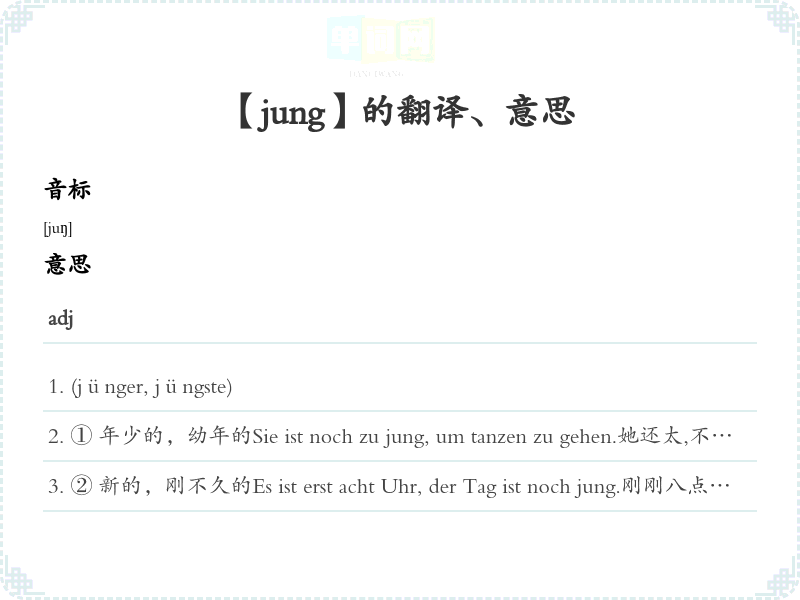 ② 新的,刚不久的Es ist erst acht Uhr, der Tag ist noch jung.刚刚八点钟,还是清早。Sie sind jung verheiratet - sie haben erst vor zwei Wochen geheiratet.他们是新婚——两星期前才接的婚。