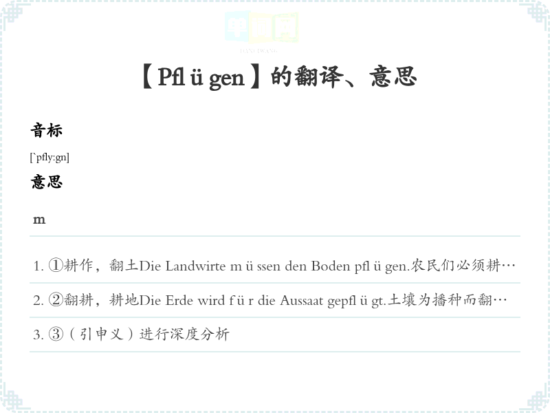 ①耕作,翻土Die Landwirte müssen den Boden pflügen.农民们必须耕作土地。