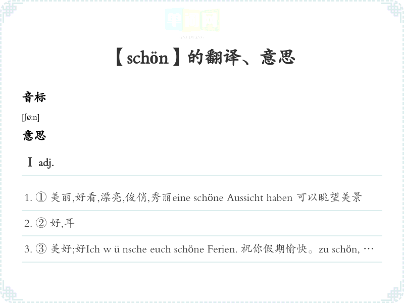 ③ 美好;好Ich wünsche euch schöne Ferien. 祝你假期愉快。zu schön, um wahr zu sein 好令人不能相信