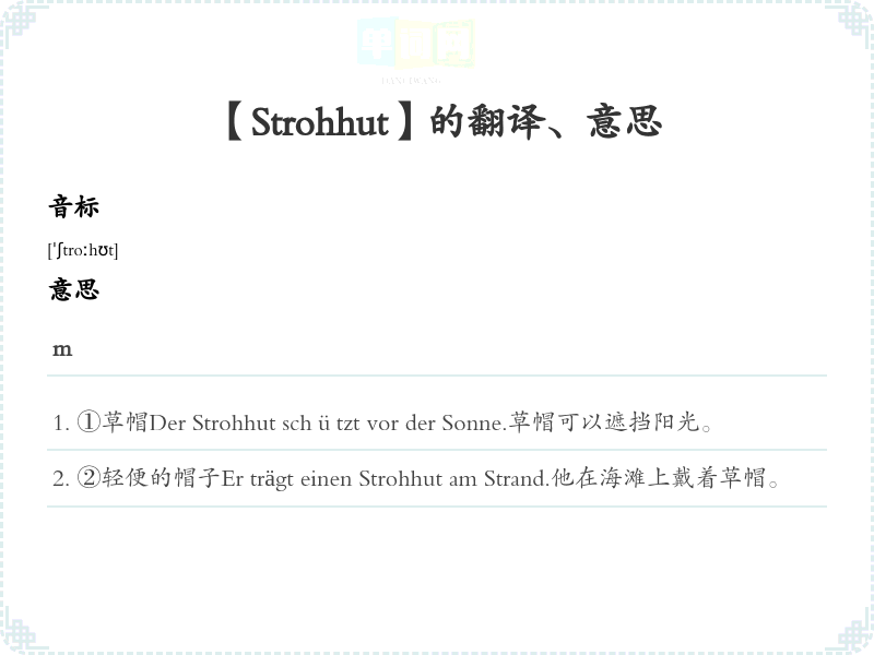 ②轻便的帽子Er trägt einen Strohhut am Strand.他在海滩上戴着草帽。