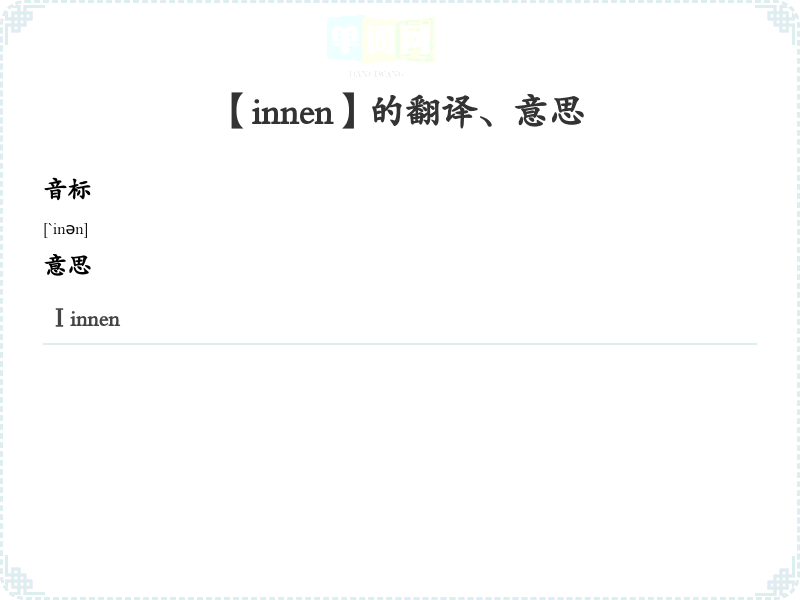 在内部,在里面Das Fenster geht nach innen auf.窗户朝里开。Ⅱ Innen-构成名词,构词有限(表示内部,里面)die Innenausstattung (eines Hauses)()内部装饰die Innenseite (eines Mantels)(大衣)内衬Ⅲ -innen构成名词(加在职业名称之后,该词可同指男士和女士)Studentinnen (统称)大学生Lehrerinnen(统称)教师 www.godic.net 版 权 所 有