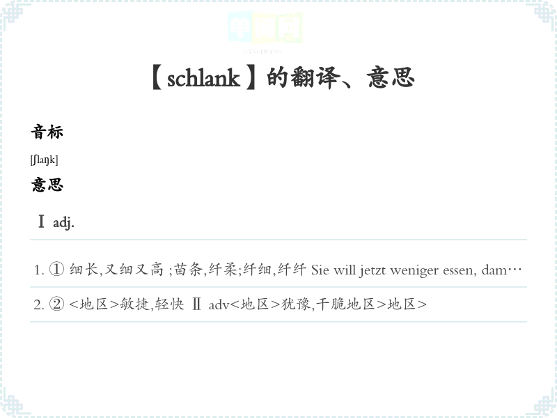 ① 细长,又细又高 ;苗条,纤柔;纤细,纤纤 Sie will jetzt weniger essen, damit sie schlanker wird.她现在吃很少,为了得苗条.