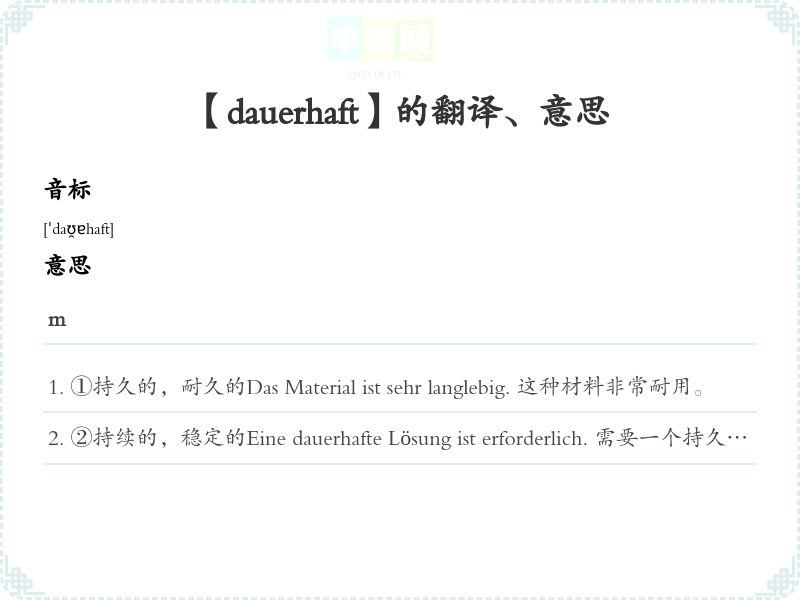①持久的,耐久的Das Material ist sehr langlebig. 这种材料非常耐用。