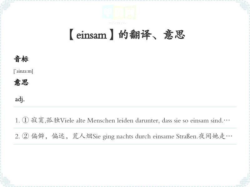 ① 寂寞,孤独Viele alte Menschen leiden darunter, dass sie so einsam sind.许多老人因孤独而痛苦。