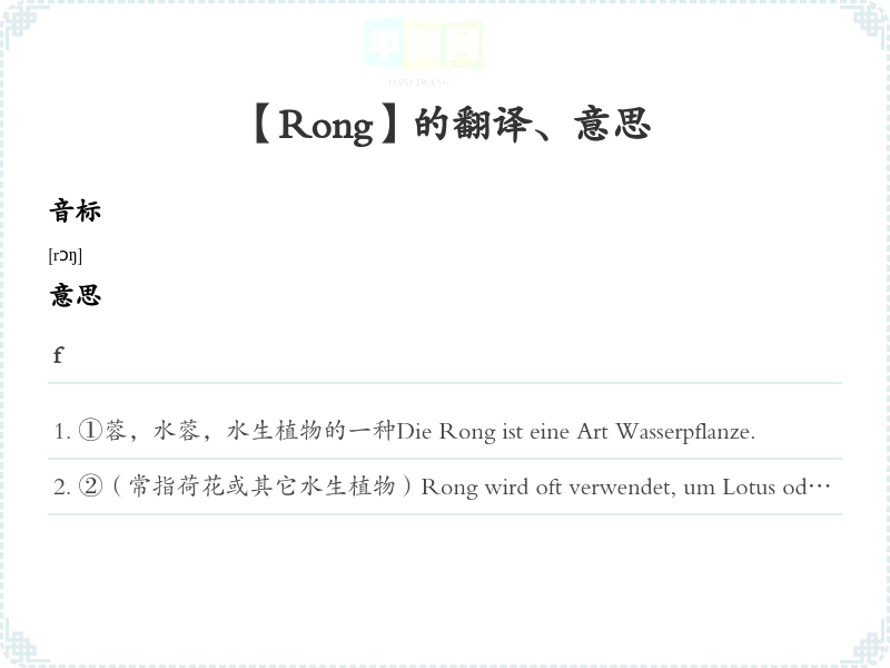 ②(常指荷花或其它水生植物)Rong wird oft verwendet, um Lotus oder andere Wasserpflanzen zu beschreiben.